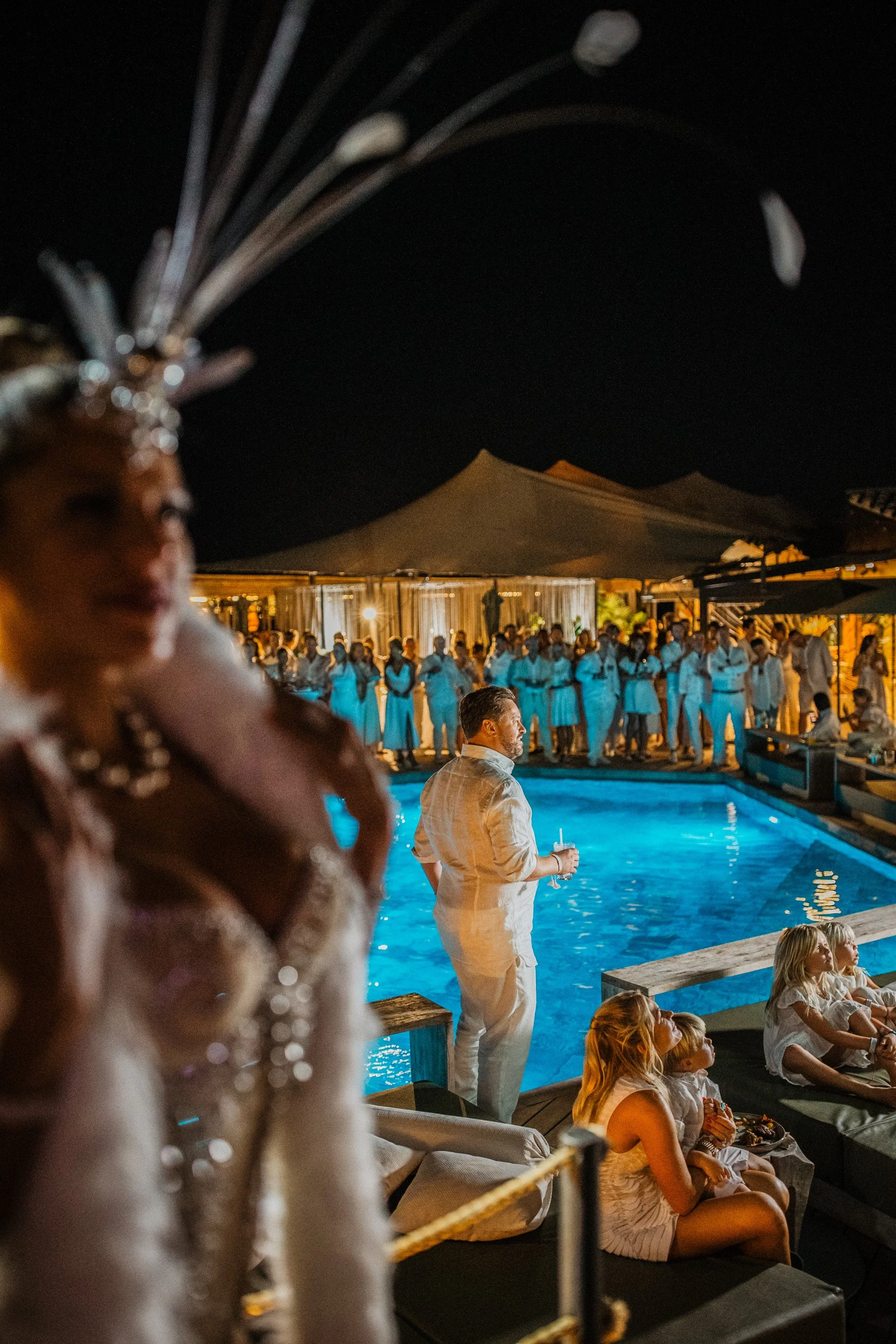 The arrival was celebrated with a White Party at an exclusive beach club. Artists performing in the air, walls covered in bespoke video mapping, and opulent costumed welcome acts set the tone for an ethereal, light, and spectacular beginning. A welcome designed to float between luxury and surprise.